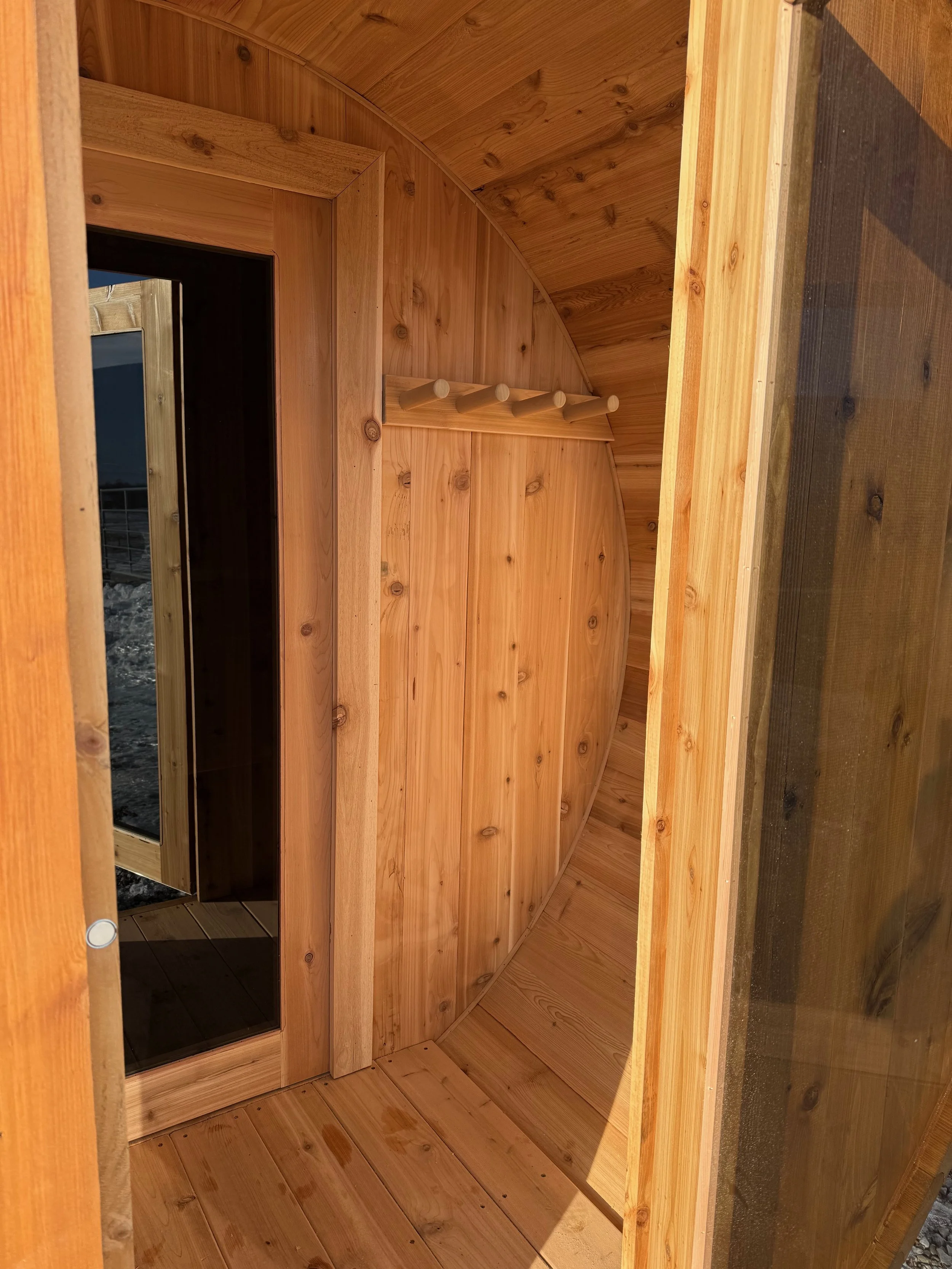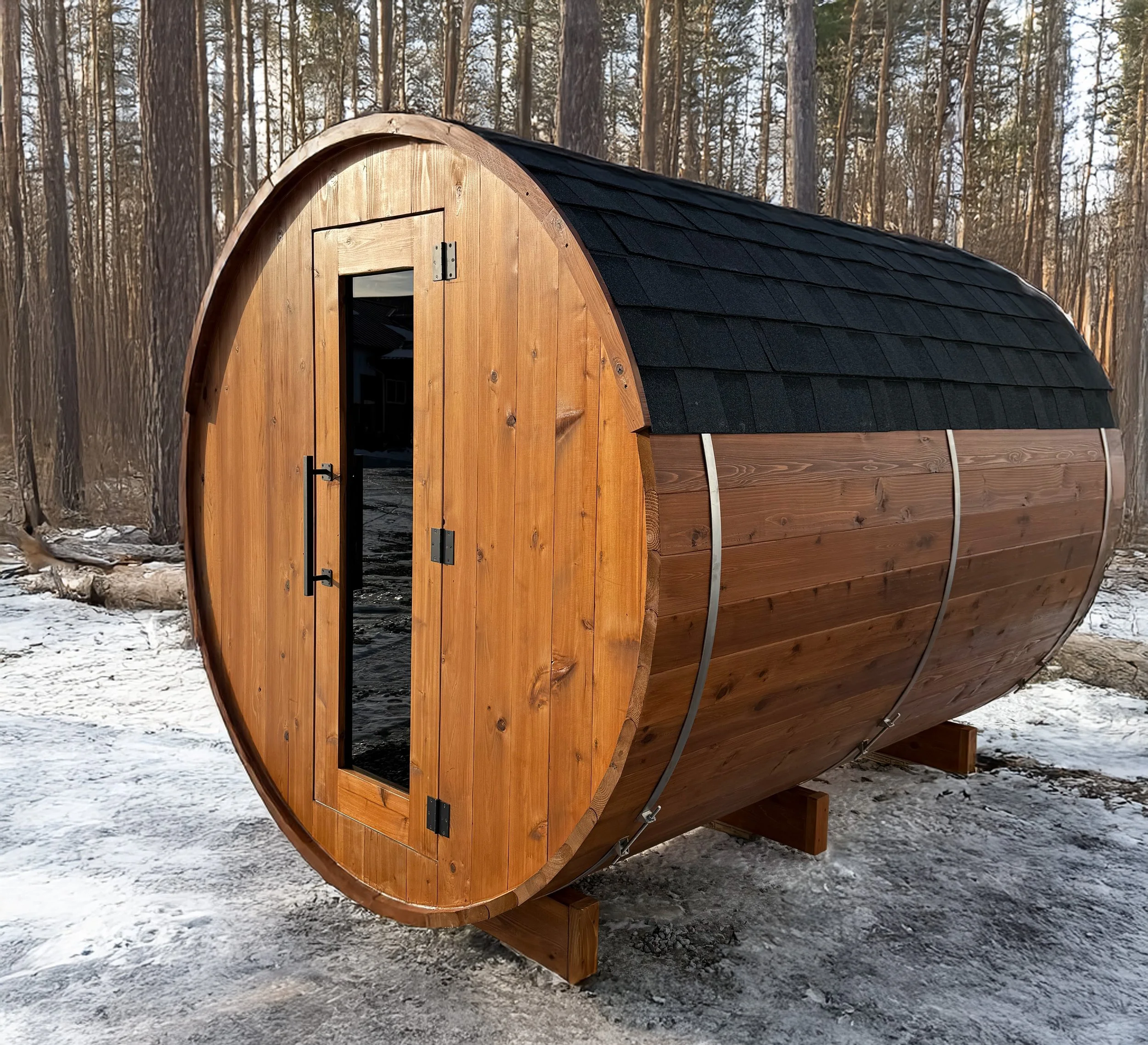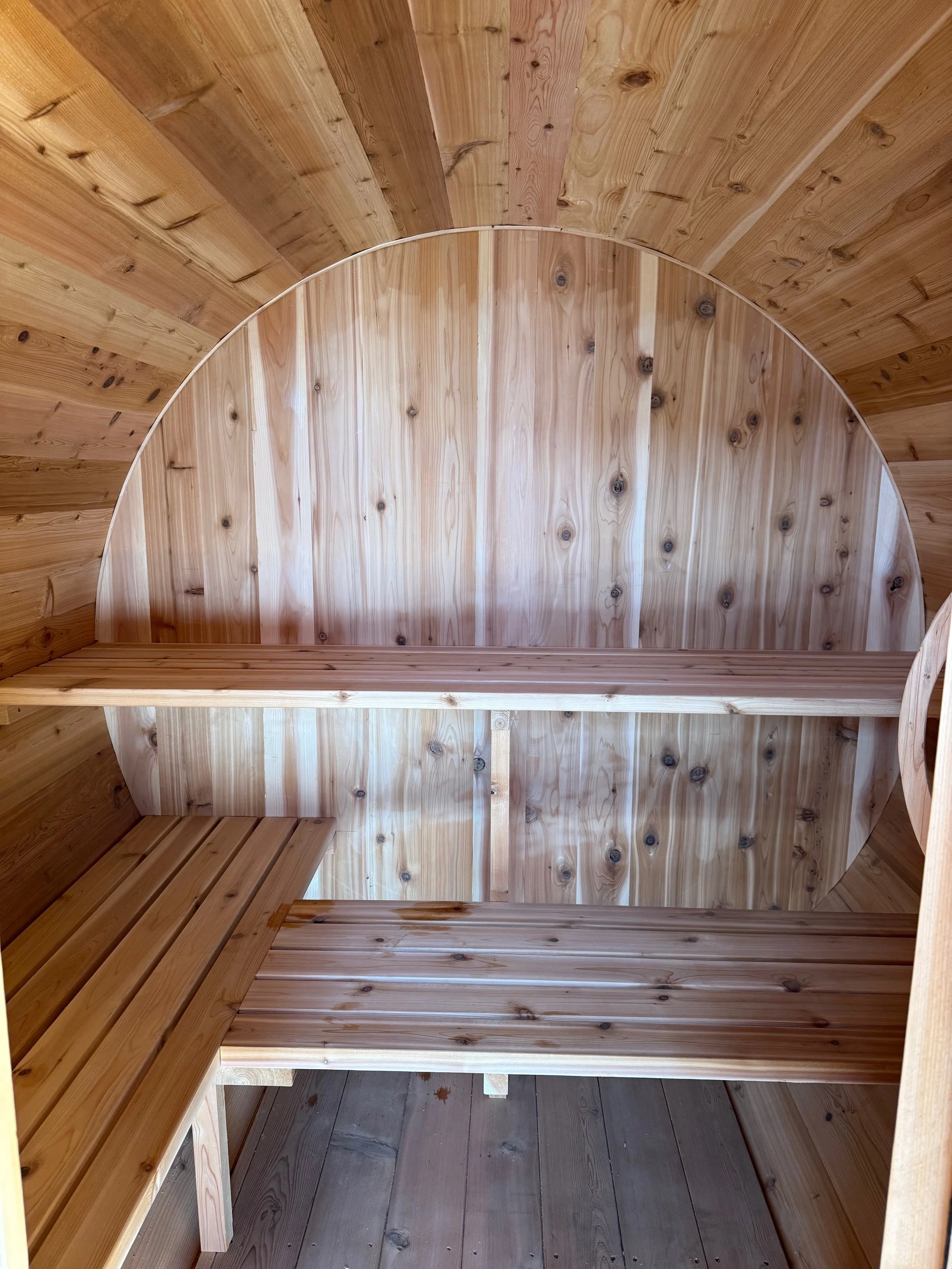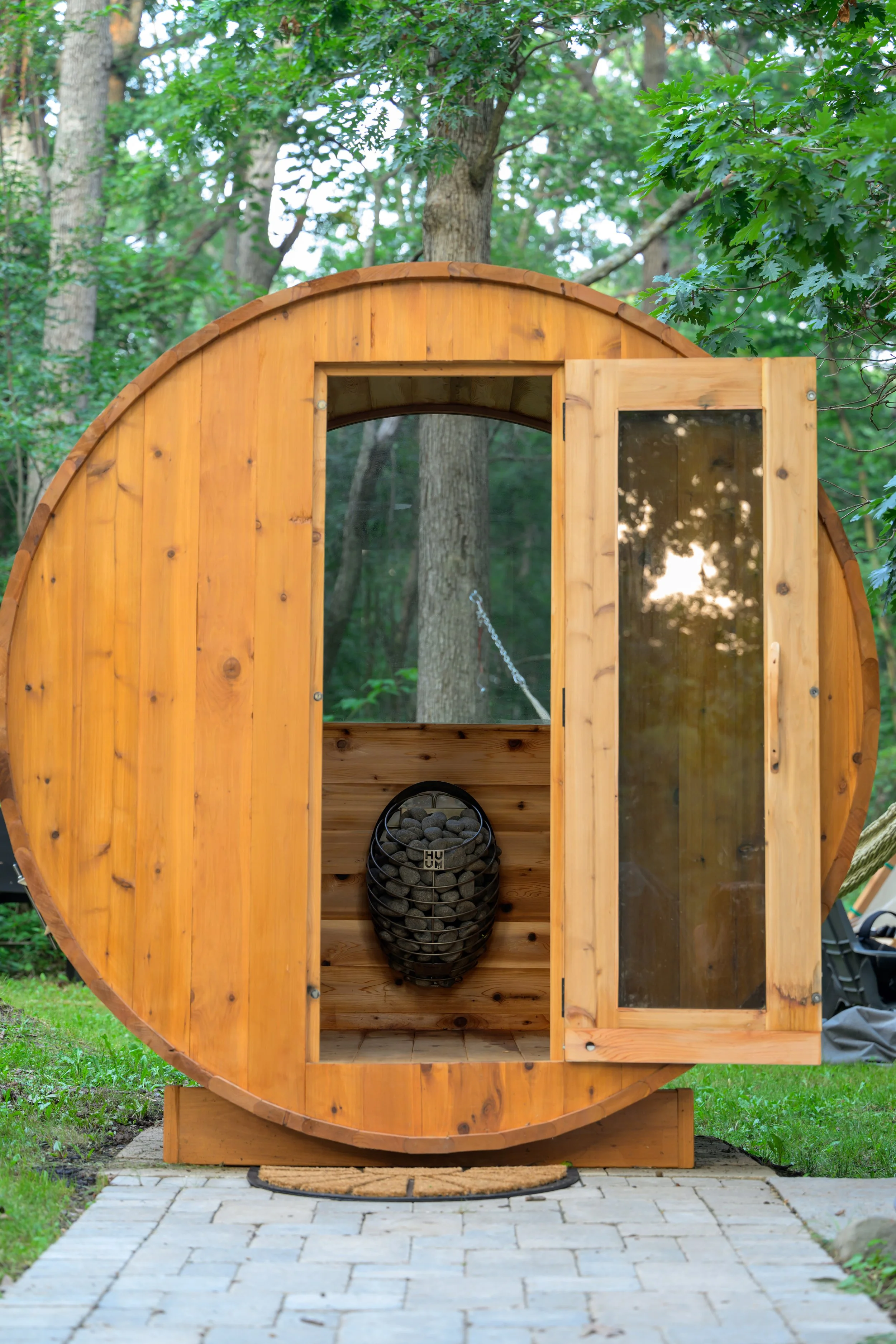 The Weekender Barrel is the most popular sauna we carry. It seats 4-6 persons. It is constructed entirely of Western Red Cedar. 7’ Diameter x 6’ length, this sauna is extra roomy. Optional additions include a 36’’ changing room, a porch, or a shingle, metal, or canvas roof. We have multiple heater options for this model including electric, natural gas, propane, or wood fired. You can also choose between a panoramic window or multi-level seating along the back wall.