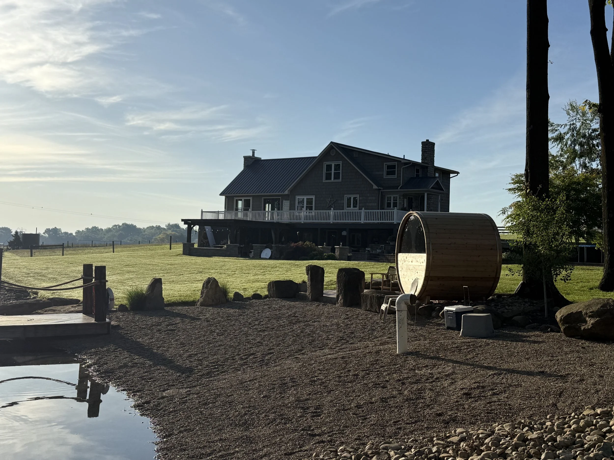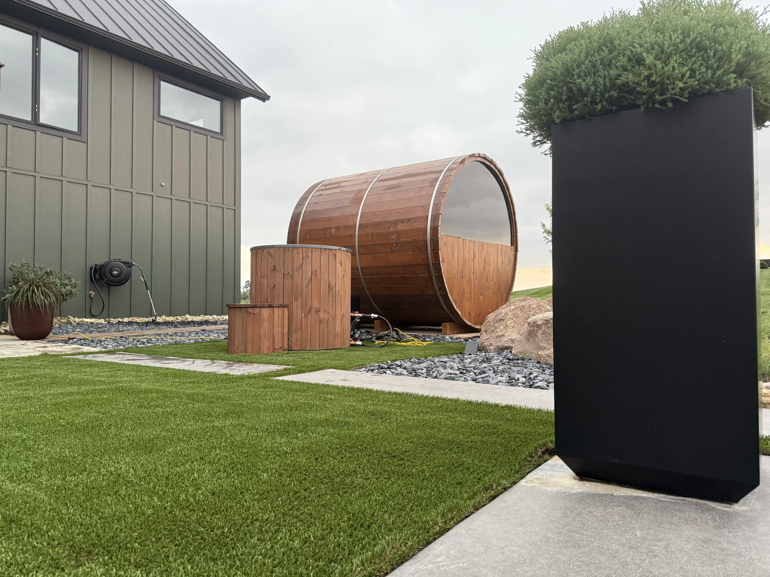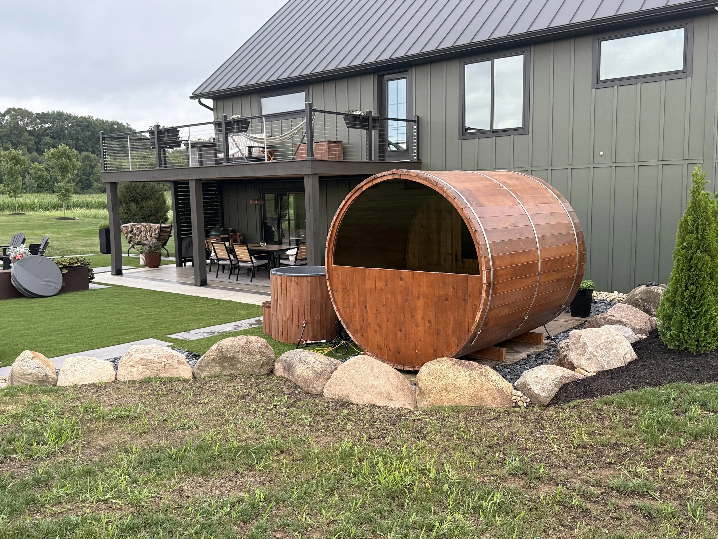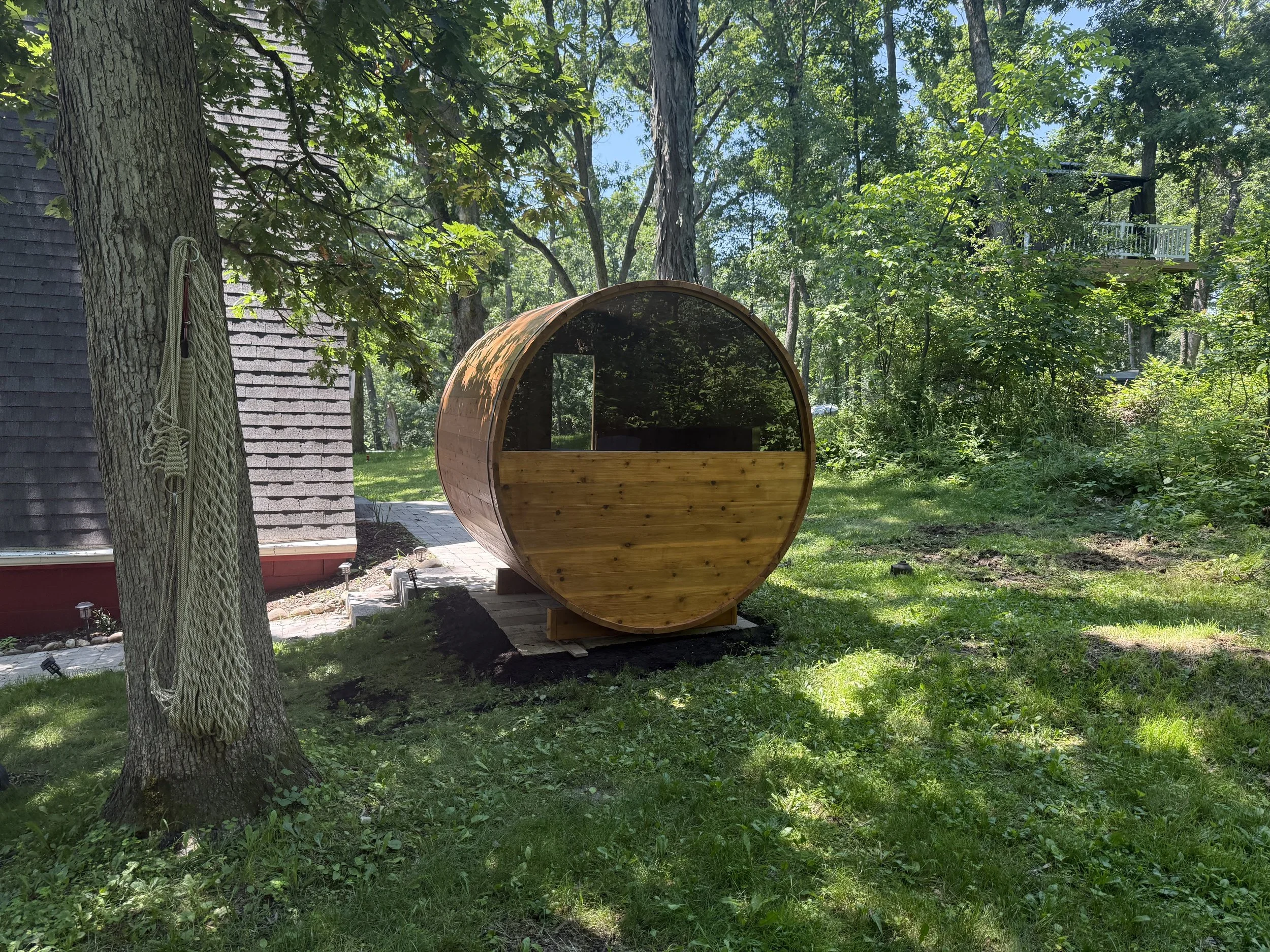 The Weekender Barrel is the most popular sauna we carry. It seats 4-6 persons. It is constructed entirely of Western Red Cedar. 7’ Diameter x 6’ length, this sauna is extra roomy. Optional additions include a 36’’ changing room, a porch, or a shingle, metal, or canvas roof. We have multiple heater options for this model including electric, natural gas, propane, or wood fired. You can also choose between a panoramic window or multi-level seating along the back wall.
